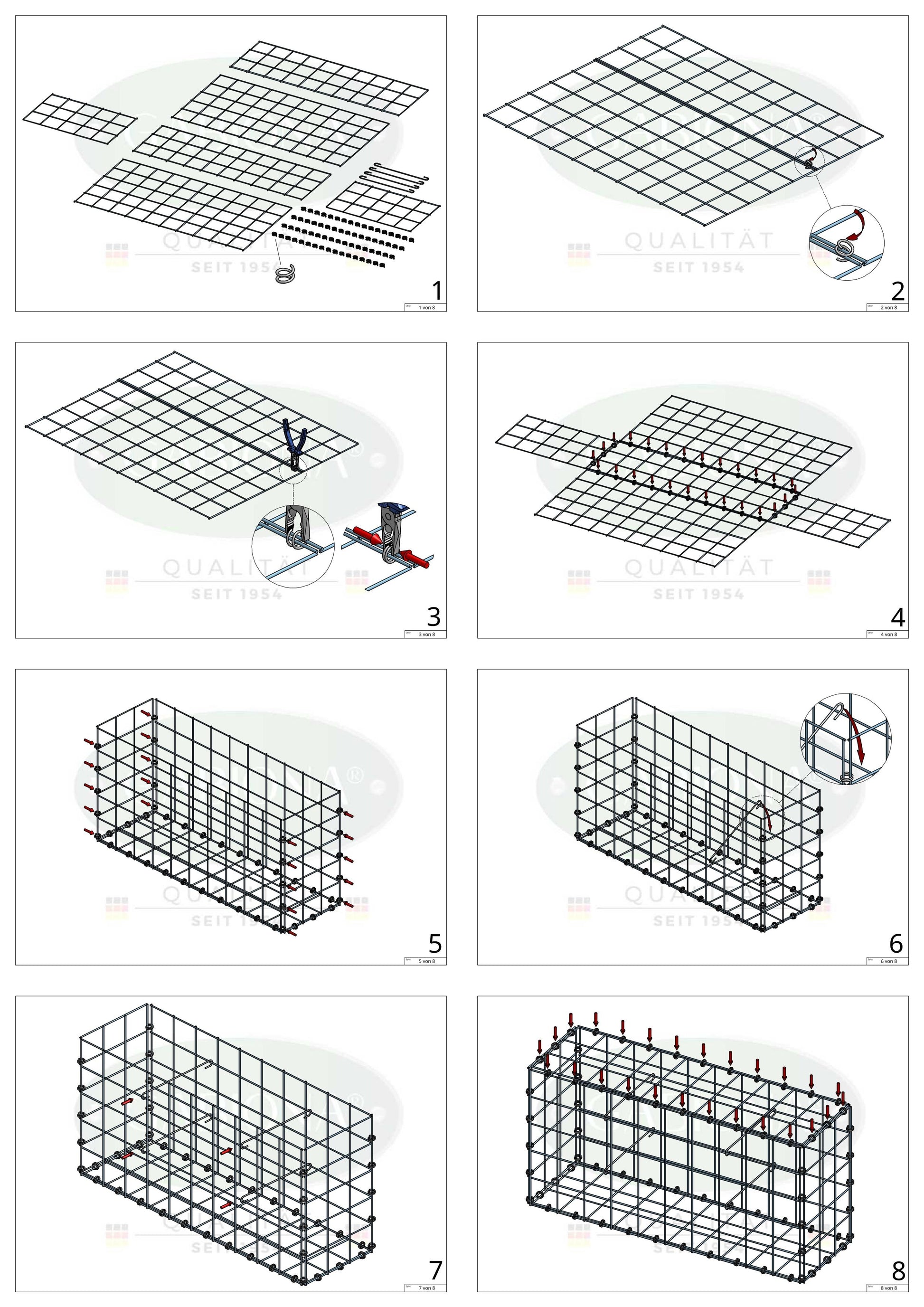 Este robusto gavión se ha desarrollado especialmente para satisfacer las más altas exigencias de estabilidad, durabilidad y resistencia a la intemperie. La construcción se cierra de forma segura con varios anillos en espiral, que se retuercen a través de dos alambres y se fijan en su sitio con unos alicates. Esto garantiza un montaje sencillo y una conexión especialmente estable entre las rejillas.
